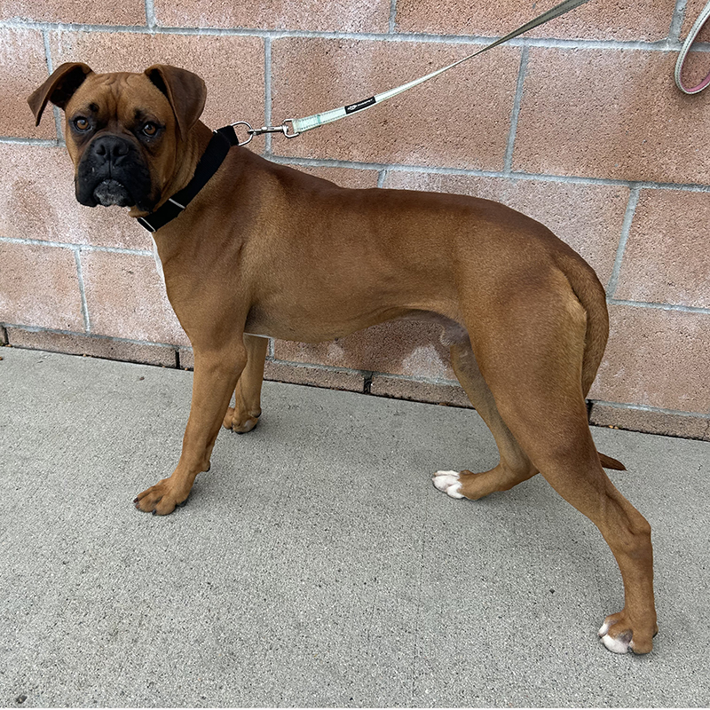 Jarvis is about 1 year old. He and his brother ended up at the San Pedro animal shelter where they were adopted together but once home some sibling rivalry developed so it was determined the brothers would do best on separate paths in life. Jarvis came to BRLA where he showed us he had little experience out in the world and very little self confidence. Our team is getting him out and about and Jarvis is showing us great potential. He is still a bit shy at first and loud noises and new things can frighten him, but he will untuck his beautiful natural tail when in the company of another nice Boxer. Especially a female. There was a 13 year old in the home that rescued him from San Pedro and he was very good with teenagers. Jarvis is housebroken and will do best in a home that can take the time to go slow with him out in the world. He does know basic commands and can sit with or without treats. He's not much into playing with toys but he loves attention. Scared boys like Jarvis are so rewarding to see them change day by day in the right hands. A home with a nice mentor dog could be perfect or lots of human interaction if he will be the only dog in the home.